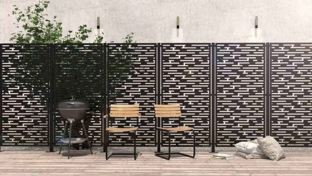 Våra skärmväggar i metall är i standardutförande 1725×825 mm i storlek och lämpar sig väldigt bra att använda bl.a. som insynsskydd och fungerar då samtidigt som vindskydd.